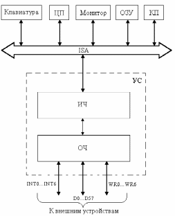 Данные из ОЗУ компьютера по системной шине ISA поступают на устройство сопряжения. Интерфейсная часть осуществляет согласование УС с системной шиной. Данные из интерфейсной части устройство передаются операционной части, с помощью которой эти данные передаются во внешние устройства.