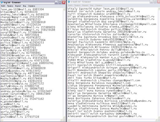 Файл icq.txt, содержащий e-mail адреса и номера ICQ.