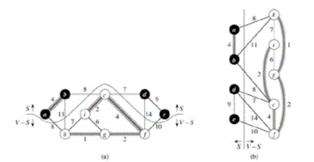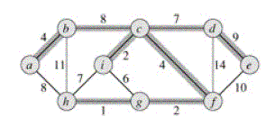 На Рис 1 показано на примере минимальное покрывающее дерево. На каждом ребре графа указан вес. Выделены ребра минимального покрывающего дерева (суммарный вес 37). Такое дерево не единственно: заменяя ребро (Ь, с) ребром (а,h), получаем другое дерево того же веса 37.