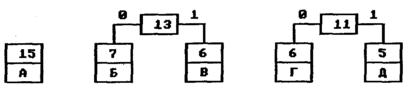 На первом шаге из листьев дерева выбираются два с наименьшими весами — Г и Д. Они присоединяются к новому узлу-родителю, вес которого устанавливается в 5+6 = 11. Затем узлы Г и Д удаляются из списка свободных. Узел Г соответствует ветви 0 родителя, узел Д — ветви 1.