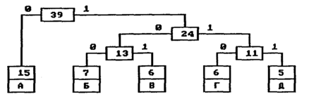 На следующем шаге «наилегчайшей» парой оказываются узлы Б/В и Г/Д. Для них еще раз создается родитель, теперь уже с весом 24. Узел Б/В соответствует ветви 0 родителя, Г/Д—ветви 1.