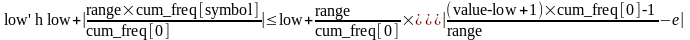 Последнее неравенство выражения (1) происходит из факта, что cum_freq[symbol-1] должно быть целым. Затем мы хотим показать, что low'≤value≤high', где low' и high' есть обновленные значения для low и high как опpеделено ниже.