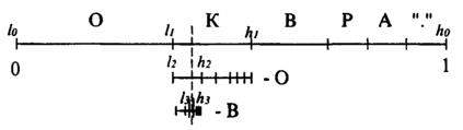 Большой вертикальной чертой на рисунке выше обозначено произвольное число, лежащее в полученном при работе интервале [/i, hi). Для последовательности "КОВ.", состоящей из четырех символов, за такое число можно взять 0.341. Этого числа достаточно для восстановления исходной цепочки, если известна исходная таблица диапазонов и длина цепочки.
