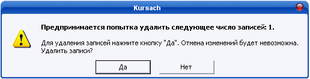 Наприклад, ми хочемо видалити якійсь запис. Ми наводемо курсором або стрілками “ ” на кнопку «видалити» і натискаєм її. З’являться наступне вікно (див. рисунок 6.2).