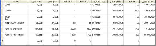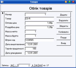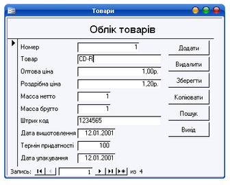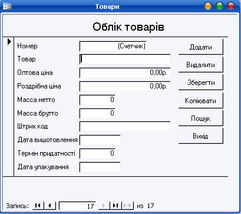 к бачимо наше діалогове вікно має досить багато кнопок, такі як: Додати, Видалити, Зберегти, Копіювати, Пошук . Також ми можемо дивитись запис товарів за допомогою кнопок