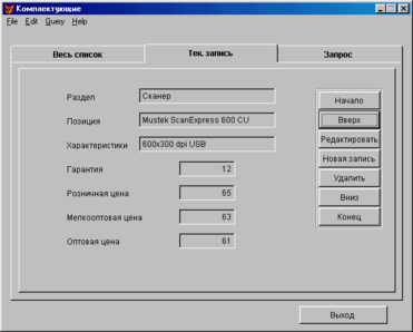 После запуска программы появляется главное окно (рис.2), которое содержит меню для работы с формой, таблицу, содержащую все записи базы данных, а также закладки для перехода на страницу работы с отдельной записью и страницу формирования SQL-запроса.