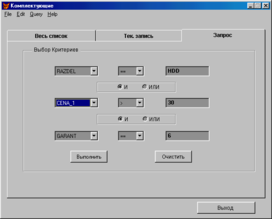 Элементы данной страницы позволяют создать SQL- запрос по трём полям базы данных с различными знаками связок в условиях и соединений (и/или) критериев отбора между собой. Выбор поля, по которому осуществляется запрос происходит из элемента управления ComboBox, который содержит все наименования полей базы. Если не указаны имена полей для выборки, кнопка «Выполнить», которая запускает сформированный запрос, неактивна.