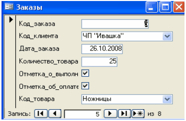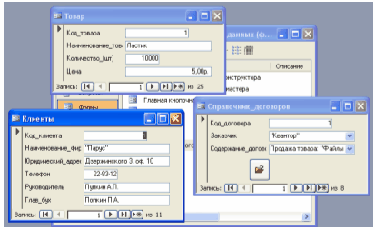 Создадим формы для ввода информации. Например, для заполнения формы - Заказы, необходимо заполнение форм-справочников: формы - Товар и формы - Клиенты; а для формы Договоры, необходима форма-справочник: Справочник договоров.