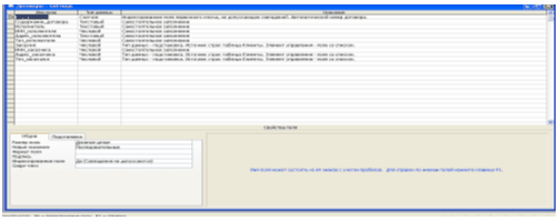 Созданные таблицы в конструкторе имеют следующий вид. В верхней части окна Конструктора каждому полю соответствует название, тип данных, описание, а в нижней части окна задаются свойства поля, такие как длина, маска ввода, условие на значение, значение по умолчанию, подпись, индекс и др.