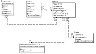 В любой коммерческой организации необходимо хранить подробную информацию о клиентах. При заключении договора регистрируются данные о виде неисправности, стоимости ремонта, запчастях необходимых для ремонта, даты, и времени необходимого для ремонта. Так же существуют данные, в которых отображается полная информация о запчастях необходимых для ремонта. Можно вводить данные о новых специалистах, и стоимость составляющих.