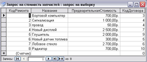 Выполним запрос на Информацию о стоимости запчастей (рисунок 12):