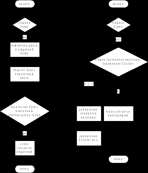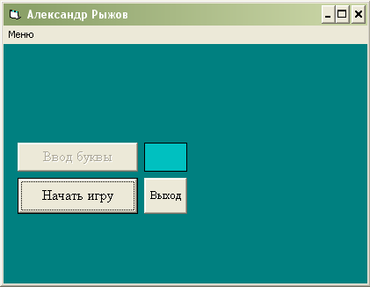Моя программа начинается с заставки. На экране появляется приветствующая надпись и кнопка входа в игру. После нажатия данной кнопки текущая форма приветствия делается невидимой, открывается форма самой игры. На этой форме находятся три кнопки и поле для ввода буквы. Кнопка для выхода из игры, для старта игры, кнопка для ввода введённой буквы в текстовое поле.