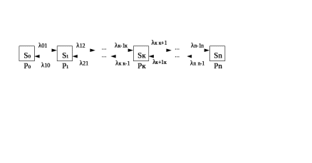 Графы состояний, используемые в моделях систем массового обслуживания, называются схемой гибели и размножения. Такое название обусловлено тем, что эта схема используется в биологических задачах, связанных с изучением численности популяции. Его особенность состоит в том, что все состояния системы можно представить в виде цепочки, в которой каждое из состояний связано с предыдущим и последующим (рис 2).