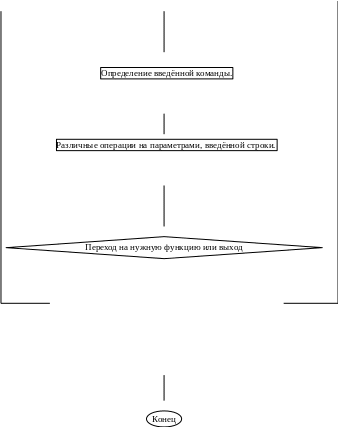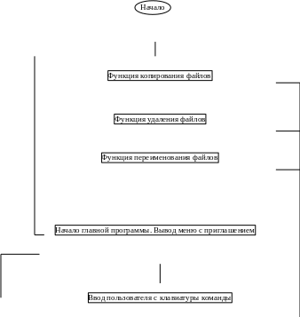 for (i=0;i if (lptr[i]==' ')break; Копирование в ff до пробела ff[i]=lptr[i];} strncat(fs,ff,i); В ff копируется посимвольно строка размером i, но при просмотре новой строки оказывалось символов не i, а в несколько раз больше, приходилось использовать strncat, она вырезает не нужные символы. И так почти на каждом шагу были проблема. Это мои первые замечания по ошибкам, возможно их прибавится. Перед началом выполнения данной курсовой работы я поставил для себя целью изучить принципы работы с файлами в операционной системе DOS, команды, позволяющие работать с файлами, а также функции и системные вызовы языка С++, позволяющие копирование, удаление, переименование файлов, работа с командной строкой. В данной работе я постаралась наиболее подробно изучить операционную систему DOS в программируемой части и частично других операционных систем, получить практические навыки работы с операционной системой DOS. В курсовой работе я буду создавать и описывать программу, которая позволит работать с файлами, а именно, копировать, переименовывать и удалять. Данная программа в дальнейшем может быть использована студентами для изучения работы с файлами на лабораторных занятиях по изучению теоретического материала и приобретения практических навыков по дисциплине «Системное Программное Обеспечение», а также программа может быть использована в работе с операционной системой MS DOS. Алгоритм решения поставленной задачи, выполненный с помощью графического метода изображения алгоритмов – блок-схемой представлен ниже. Для реализации моей задачи используется следующий алгоритм (рисунок 1.). Описание алгоритма: Ввод команды с клавиатуры Индификация вводимой команды Операции над параметрами команды Выполнение команды Моя программа интерпретирует команды MS DOS В программе можно пользоваться четырьмя командами: Exit- программа завершается. Copy – копирование файла или файлов. Ren –переименование файла. Del –Удаление файла. В программе я использую встроенные библиотеки С++. Таб. 1 В основном программа работает со строковыми функциями. Эти функции нужны для обработки строк с клавиатуры, для устранения ошибок С++. strtok –для устранения ошибок в строке strncat -копирует определённое количество символов в переменную. strstr - для поиска слова в строке. strcpy –копирует строку в переменную. strcat –добавляет строку в переменную. Strrev- реверсирует строку. Strlen- определяет количество символов в строке Strlwr-все символы преобразовывает в строчные. Strpbrk- ищет определённые символы. Почти в любой программе не обойдешься без собственных функций, они упрощают программирование, программа становится более понятна и удобна в изучении. В моей программе я использую шесть своих функций FILCOP, GAD, GIP, DELFILE, RENFILE, COPYES. Filcop - функция для копирования файлов. Gad – функция для выреза одного пути без имени файла из строки. Gip – функция для выреза одного имени файла из строки. Delete- функция удаления файлов. Renfile- функция переименования файлов. Copyes- функция обрабатывающая строку и вызова функции Filcop. Она разделяет строку на два параметра копирования- какой файл и куда копировать с учётов шаблонов (*?). После загрузки программы появится меню с приглашением «>>>> ». Теперь можно вводить команды. После ввода команды программа определяет её. Если: EXIT - программа завершается. REN –оставляет в введённой строке только два параметра (какой файл, на какой переи
