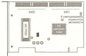Компоновка типичного IDE-контроллера показана на рис. 1. Стандартный IDE-накопитель подключается к контроллеру с помощью 40-жильного кабеля. (В старых разработках 1ВМ использовался 44 или 72-жильный кабель). Этот сигнальный кабель предназначен для передачи данных и управляющих сигналов между накопителем и контроллером. Как и в SCSI-устройствах, в IDE-накопителях для обеспечения параметров линий связи и электрических характеристик сигналов также устанавливаются нагрузочные сопротивления, но они, в отличие от согласующих резисторов в интерфейсе SCSI, обычно впаяны в плату и не могут быть удалены. В большинстве случаев два накопителя IDE/EIDEтипа могут работать совместно при наличии согласующих сопротивлений в каждом из них, Если на накопителе имеются перемычки выбора режима, то с их помощью конкретное устройство можно сделать либо ведущим (master), либо ведомым (slave).