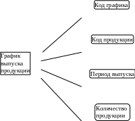 Сущность «График выпуска продукции» для обеспечения выполнения объявленных функций должна характеризоваться следующими экземплярами: код графика, код продукции, период выпуска, количество продукции (рис.3).