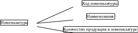 «Продукция» состоит в «Номенклатуре продукции». Сущность «Номенклатура продукции» имеет следующие экземпляры сущности: код номенклатуры, наименование, количество продукции в номенклатуре (рис.2).