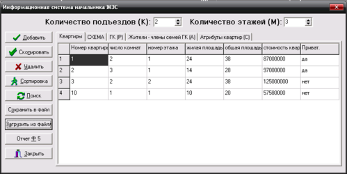 – компонент PageControl1 – содержит вкладки TabSheet 1–5 на которых отражены данные (соответственно «Квартиры», «СХЕМА», «ГК (Р)», «Жители члены семей ГК (А)», и «Атрибуты квартир (С)»).