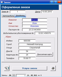 Форма «Оформление заказа» является ключевой формой в данном проекте. Оформление заказа производится либо для уже существующего клиента автосервиса и его зарегистрированного ранее автомобиля, либо для клиента, впервые прибывшего в автосервис. Если информация о клиенте уже есть в базе данных (пользовался услугами автосервиса ранее), но нет информации о его новом автомобиле, то перед оформлением заказа следует зарегистрировать новый автомобиль, после чего продолжить оформление заказа.