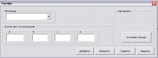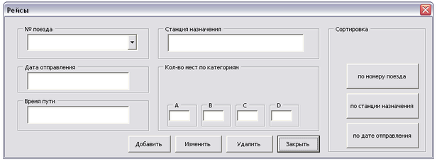 Для работы с таблицей предусмотрена пользовательская форма «Рейсы», которая вызывается с панели задач. В этой форме осуществляется ввод, удаление, корректировка, сортировка записей.