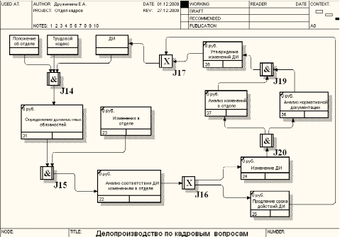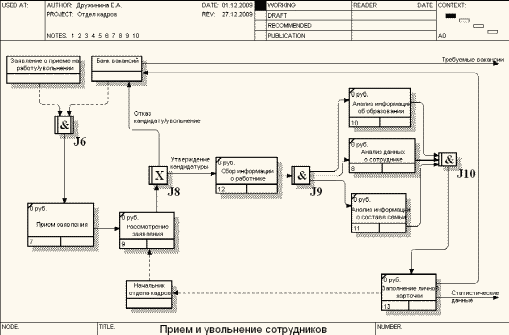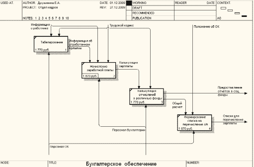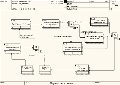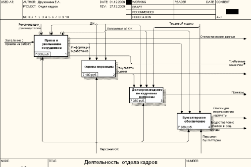 Модель представляет систему в виде контекстной диаграммы – одной работы «Деятельность отдела кадров» и дуг, изображающих интерфейсы с функциями вне системы. Эта работа декомпозируется на последующих диаграммах: «Прием и увольнение сотрудников», «Оценка персонала», «Делопроизводство по кадровым вопросам», «Бухгалтерское обеспечение».