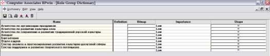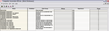 Словарь ролей Role Dictionary определяет должность или позицию конкретного исполнителя. Каждой роли может соответствовать одна или несколько групп ролей. Кроме того, в словаре ролей для каждой роли можно внести определение, связать роль с изображением и геометрической фигурой, указать важность роли.
