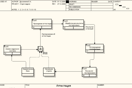 Была разработана модель деятельности отдела кадров с помощью программного средства BPwin, описывающая существующую организацию работы. Модель включает структурную функциональную модель деятельности в соответствии со стандартом IDEF0 и три декомпозиции в виде диаграммы переходов состояний в соответствии со стандартом IDEF3.