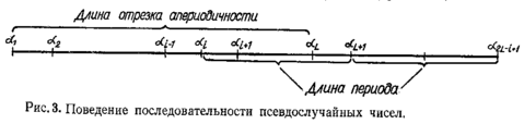 При проверке качества псевдослучайных чисел прежде всего интересуются длиной отрезка апериодичности и длиной периода (рис. 3). Под длиной отрезка апериодичности L понимается совокупность последовательно полученных случайных чисел α1, …, αL таких, что αi