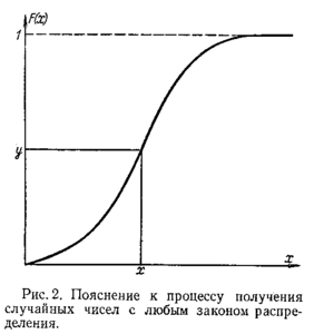 Для получения значения X берётся число из таблиц случайных чисел, имеющих равномерное распределение, которое откладывается на оси ординат (рис. 2), и на оси абсцисс считывается соответствующее число X. Повторив неоднократно эту процедуру, получим набор случайных чисел, имеющих закон распределения F(x). Таким образом, основная проблема заключается в получении равномерно распределённых в интервале [0,1] случайных чисел. Один из методов, который используется при физическом способе получения случайных чисел для ЭВМ, состоит в формировании дискретной случайной величины, которая может принимать только два значения: 0 или 1 с вероятностями