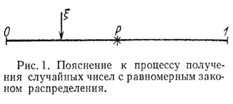 Для пояснения целесообразно обратиться к рис. 1, на котором весь набор случайных чисел представляется в виде точек отрезка [0,1]. Вероятность попадания случайной величины ξ, имеющей равномерное распределение в интервале [0,1], в интервал [0, p] (где