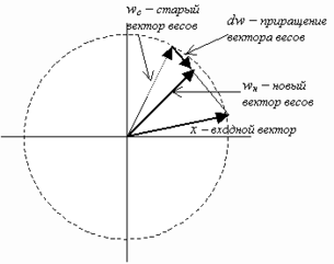 Входной вектор x перед подачей на вход нейросети нормируется, т.е. располагается на гиперсфере единичного радиуса в пространстве весов. При коррекции весов по правилу (6) происходит поворот вектора весов в сторону входного вектора. Постепенное уменьшение скорости поворота позволяет произвести статистическое усреднение входных векторов, на которые реагирует данный нейрон.