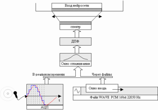 После нормирования и сжатия спектр накладывается на вход нейросети. Входы нейросети не выполняют никаких решающих функция, а только передают сигналы дальше в нейросеть. Выбор числа входов – сложная задача, потому что при малом размере входного вектора возможна потеря важной для распознавания информации, а при большом существенно повышается сложность вычислений (только при моделировании на PC, в реальных нейросетях это неверно, т.к. все элементы работают параллельно).