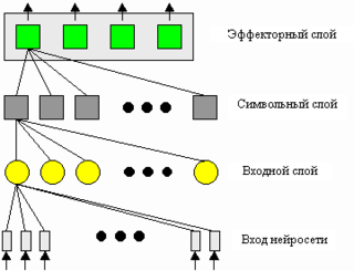 Нейросеть имеет довольно простую структуру и состоит из трех уровней: входной слой, символьный слой и эффекторный слой (рис. 4). Каждый нейрон последующего слоя связан со всеми нейронами предыдущего слоя. Функция передачи во всех слоя линейная, во входном слое моделируется конкуренция.