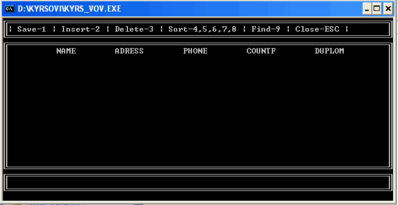 for(i1=kyt_vl_x;i1 gotoxy(i1,kyt_vl_y-1); putchar(205); } for(i1=kyt_vl_y;i1 gotoxy(dov_x,i1); putchar(186); } for(i1=dov_x-1;i1>kyt_vl_x-1;i1--){ gotoxy(i1,dov_y); putchar(205); } for(i1=dov_y-1;i1>kyt_vl_y-1;i1--){ gotoxy(kyt_vl_x-1,i1); putchar(186); } gotoxy(kyt_vl_x-1,kyt_vl_y-1); putchar(201); gotoxy(dov_x,kyt_vl_y-1); putchar(187); gotoxy(dov_x,dov_y); putchar(188); gotoxy(kyt_vl_x-1,dov_y); putchar(200); } /*--------------------Ramka-----------------------------------*/ int page=0; int page_count=0; int pos=0; struct value { char name[30]; char adress[30]; char phone[15]; char countf[5]; char duplom[30]; }; struct mai { int count; value m[100]; }; mai list; void refresh_list() { int li=6; int dest; page_count = 0; int tmpl=list.count; while (tmpl-15>0) { tmpl=tmpl-15; page_count++; } if (page*15+15>list.count) { dest=list.count; } else { dest=page*15+14; } for (int i=0;i<15;i++) { gotoxy(9,i+6); printf(" "); } for (i=page*15;i<=dest;i++) { gotoxy(12,li); printf(list.m[i].name); gotoxy(24,li); printf(list.m[i].adress); gotoxy(38,li); printf(list.m[i].phone); gotoxy(51,li); printf(list.m[i].countf); gotoxy(65,li); printf(list.m[i].duplom); li++; } } void insert_list() { char s[100]; list.count++; gotoxy(1,1); printf("%d",list.count); gotoxy(3,23); printf("Enter Name "); scanf("%s",&s); strcat(list.m[list.count].name,s); gotoxy(3,23); printf(" "); gotoxy(3,23); printf("Enter Adress "); scanf("%s",&s); strcat(list.m[list.count].adress,s); gotoxy(3,23); printf(" "); gotoxy(3,23); printf("Enter Phone "); scanf("%s",&s); strcat(list.m[list.count].phone,s); gotoxy(3,23); printf(" "); gotoxy(3,23); printf("Enter Count Fakultet "); scanf("%s",&s); strcat(list.m[list.count].countf,s); gotoxy(3,23); printf(" "); gotoxy(3,23); printf("Enter Duplom "); scanf("%s",&s); strcat(list.m[list.count].duplom,s); gotoxy(3,23); printf(" "); refresh_list(); } void save_list() { FILE *f; f=fopen("с:\\vuz.my","w+"); for (int i=0;i<=list.count;i++) { char tmp[150]; strcpy(tmp,list.m[i].name); strcat(tmp,","); strcat(tmp,list.m[i].adress); strcat(tmp,","); strcat(tmp,list.m[i].phone); strcat(tmp,","); strcat(tmp,list.m[i].countf); strcat(tmp,","); strcat(tmp,list.m[i].duplom); fprintf(f,"%s\n",tmp); } fclose(f); } void delete_list() { if (page*15+pos<=list.count) { for (int i=page*15+pos;i { list.m[i]=list.m[i+1]; } list.count--; refresh_list(); } } void sort_list(int vub) { value tmpv; if (vub==0) { for (int i=0;i<=list.count;i++) { for (int j=0;j<=list.count;j++) { if (strcmp(list.m[i].name,list.m[j].name)<0) { tmpv=list.m[i]; list.m[i]=list.m[j]; list.m[j]=tmpv; } } } } if (vub==1) { for (int i=0;i<=list.count;i++) { for (int j=0;j<=list.count;j++) { if (strcmp(list.m[i].adress,list.m[j].adress)<0) { tmpv=list.m[i]; list.m[i]=list.m[j]; list.m[j]=tmpv; } } } } if (vub==2) { for (int i=0;i<=list.count;i++) { for (int j=0;j<=list.count;j++) { if (strcmp(list.m[i].phone,list.m[j].phone)<0) { tmpv=list.m[i]; list.m[i]=list.m[j]; list.m[j]=tmpv; } } } } if (vub==3) { for (int i=0;i<=list.count;i++) { for (int j=0;j<=list.count;j++) { if (strcmp(list.m[i].countf,list.m[j].countf)<0) { tmpv=list.m[i]; list.m[i]=list.m[j]; list.m[j]=tmpv; } } } } if (vub==4) { for (int i=0;i<=list.count;i++) { for (int j=0;j<=list.count;j++) { if (strcmp(list.m[i].duplom,list.m[j].duplom)<0) { tmpv=list.m[i]; list.m[i]=list.m[j]; list.m[j]=tmpv; } } } } refresh_list(); } void find_list() { int vub; mit_1: gotoxy(3,23); printf(" "); gotoxy(3,23); printf("FIND: | Name-1 | Adress-2 | Phone-3 | CountF-4 | Duplom-5 | "); cursor(1); scanf("%d",&vub); if((vub5)){goto mit_1;} gotoxy(3,23); printf(" "); gotoxy(3,23); printf("Find Text: "); char s[50]; scanf("%s",&s); for (int i=0;i<=list.count;i++) { char s1[50]; switch(vub) { case 1: strcpy(s1,list.m[i].name);break; case 2: strcpy(s1,list.m[i].adress);break; case 3: strcpy(s1,list.m[i].phone);break; case 4: strcpy(s1,list.m[i].countf);break; case 5: strcpy(s1,list.m[i].duplom);break; } if (strcmp(s1,s)==0) { gotoxy(3,pos+6); printf(" "); int j=i; int l=0; while (j-15>=0) { j=j-15; l++; } page=l; pos=j; refresh_list(); gotoxy(3,pos+6); printf(">"); gotoxy(3,23); printf("Press ENTER "); mit_2: int c=getche(); if (c!=13){goto mit_2;} } } cursor(0); gotoxy(3,23); printf(" "); } void new_window(int vub) { clrscr(); cursor(0); ramka(2,2,80,3); ramka(2,5,80,21); ramka(2,23,80,24); gotoxy(2,2); printf("| Save-1 | Insert-2 | Delete-3 | Sort-4,5,6,7,8 | Find-9 | Close-ESC |"); gotoxy(12,5); printf("NAME ADRESS PHONE COUNTF DUPLOM"); if (vub==1) { refresh_list(); } pos=0; mi2: gotoxy(3,23); int c=getche(); switch (c) { case 49:save_list(); break; case 50:insert_list(); break; case 51:delete_list(); break; case 52:sort_list(0); break; case 53:sort_list(1); break; case 54:sort_list(2); break; case 55:sort_list(3); break; case 56:sort_list(4); break; case 57:find_list(); break; case 72: if (pos!=0) { gotoxy(3,pos+6); printf(" "); pos--; gotoxy(3,pos+6); printf(">"); } else { if (page!=0) { page--; gotoxy(3,pos+6); printf(" "); pos=14; refresh_list(); } } break; case 80: if (pos!=14) { gotoxy(3,pos+6); printf(" "); pos++; gotoxy(3,pos+6); printf(">"); } else { if (page_count>page) { gotoxy(3,pos+6); printf(" "); page++; pos=0; refresh_list(); } } break; case 27:goto mi1;break; } goto mi2; mi1: } void open_list() { clrscr(); FILE *f; f=fopen("с:\\vuz.my","r"); char *s; list.count=-1; while(! feof(f)) { list.count++; fscanf(f,"%s\n",s); // printf("%s\n",s); char *p; p = strtok(s,","); int l=0; while (p) { switch(l) { case 0:strcpy(list.m[list.count].name,p);break; case 1:strcpy(list.m[list.count].adress,p);break; case 2:strcpy(list.m[list.count].phone,p);break; case 3:strcpy(list.m[list.count].countf,p);break; case 4:strcpy(list.m[list.count].duplom,p);break; } l++; p = strtok(NULL,","); } } fclose(f); } void main_menu() { mit_3: clrscr(); ramka(2,2,80,24); ramka(20,8,60,16); gotoxy(35,10); printf("New list - 1"); gotoxy(35,12); printf("Open list - 2"); gotoxy(35,14); printf("Exit - 3 "); cursor(0); mi