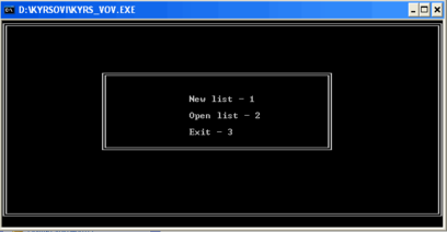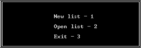 По середині буде показано меню з трьох пунктів new list, open list exit, за допомогою яких можна у будь-який момент змінити настройки у програмі чи вийти з програми. Форма основного меню показана нижче (див. Мал. 1).
