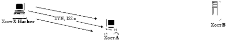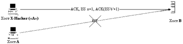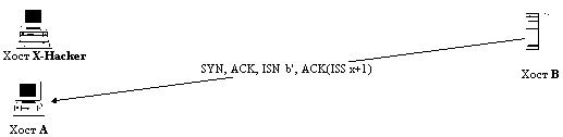 Рис.2.4 Хост X-Hacker никогда не получит значения ISNb' от хоста B, но, используя математическое предсказание ISN, посылает на B от имени A пакет с ISNb'. При этом Хост A не может послать пакет с битом RST.
