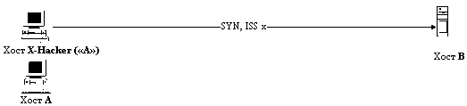 Рис.2.1. X-Hacker посылает на Хост A серию TCP-запросов на создание соединения, заполняя тем самым очередь запросов, с целью вывести из строя на некоторое время Хост A.