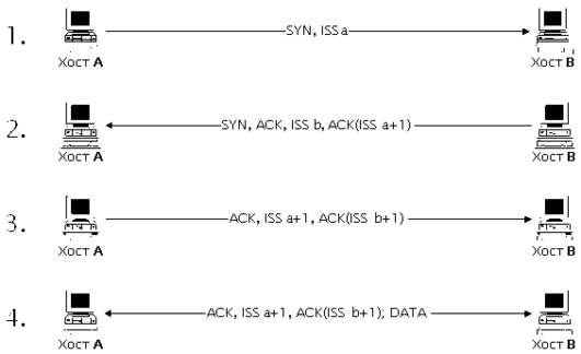 Предположим, что хосту А необходимо создать TCP-соединение с хостом В. Тогда А посылает на В следующее сообщение: