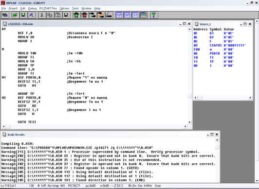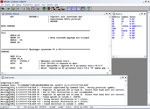 Запустить оболочку MPLAB v 3.40 (Пуск\Программы\Microchip MPLAB\MPLAB). Появится окно, изображенное на рис. 5.1. прокомпилировать и выполнить проект.