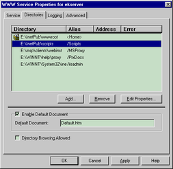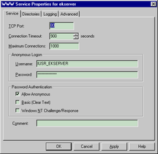 Настройки IIS приведены на рисунках ниже. В них предполагается, что компьютер имеет имя EKSERVER и созданный по умолчанию пользователь, которым олицетворяется IIS-анонимный пользователь, называется IUSR_EKSERVER.