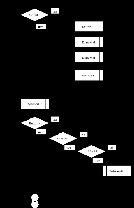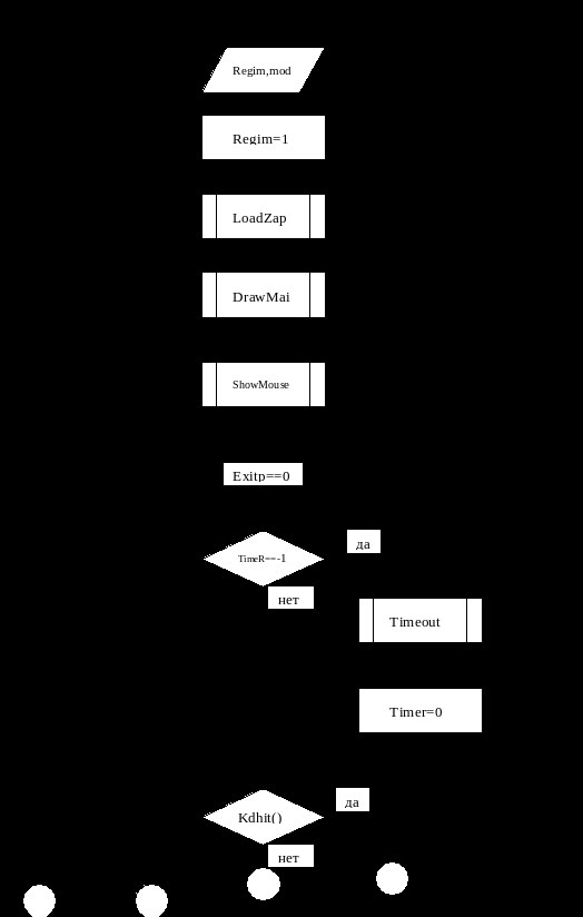 for(i=0;i { str[i]=' '; }; int ic; char chr; int nb1=nb,nb2=nb; if(rzc!=0){if(nb>100)nb2=30; for(i=0;i for(i=((rzc!=0)?nb1:0);i { ic=getch(); if(ic==13)break; if(ic==27){nzap--;i=nb;}; if(ic==8){str[i-1]=' ';i=i-2;gotoxy(wherex()-2, wherey()); cout<<"_"; cout<<" "; gotoxy(wherex()-1,wherey());} else{ chr=Conv(ic); str[i]=chr; gotoxy(wherex()-1,wherey()); cout< cout<<"_"; }; }; gotoxy(wherex()-1,wherey()); cout<<" "; str[nb-1]='\0'; }; void NewZap(int rzc) //rzc: 0-new 1-correct { HideMouse(); cleardevice(); if(rzc!=0){gotoxy(20,9); cout<<"корректировка :";}; gotoxy(20,10); cout<<"наименование : "; GetPole(&name[0],20,rzc); gotoxy(20,11); cout<<"единицы измерений : "; GetPole(&ed_ism[0],5,rzc); gotoxy(20,12); cout<<"количество : "; GetPole(&col_vo[0],10,rzc); gotoxy(20,13); cout<<"дата поступления : "; GetPole(&datep[0],10,rzc); gotoxy(20,14); cout<<"дополнительные данные: "; GetPole(&inform[0],200,rzc); for(int i=0; i<15; i++) user[i]=userprg[i]; }; }; DataF Zap[125]; void LoadZap() { clrscr(); gotoxy(10,10); cout<<" введите своё имя: "; cin>>userprg; FILE *f; f=fopen("ttt.cfg","r"); nzap=1; while (!feof(f)) { fread(&Zap[nzap],sizeof(DataF),1,f); nzap++; }; nzap--; fclose(f); }; void SaveZap() { FILE *f; f=fopen("ttt.cfg","w"); for (int i=1;i fclose(f); }; void append() { FILE *f; f=fopen("ttt.cfg","a"); fwrite(&Zap[nzap],sizeof(DataF),1,f); fclose(f); }; void MouseStatus(int *x,int *y,int *button) { int bb,xx,yy; asm { mov ax,03; int 33h; mov bb,bx; mov xx,cx; mov yy,dx; }; *button=bb; *x=xx; *y=yy; }; void Information() { HideMouse(); char ch; int exitInf=0; cleardevice(); gotoxy(18,9); cout<<"разработано Можайко А.С."; ch=getch(); DrawMain(regim); ShowMouse(); }; void DrawMain(int regim) { cleardevice(); const char MenuItem[6][16]={" ", " „добавить ", " просмотр ", " корректировка ", " удалить ", " выход "}; setcolor(1); setbkcolor(1); for (int i=1;i<=5;i++) { setfillstyle(1,i==regim?9:10); fillellipse(300,55+i*60,90,20); outtextxy(238,50+i*60,MenuItem[i]); }; Timeout(); ShowMouse(); }; void ShowMouse(void) { asm { mov ax,01h int 33h } }; void HideMouse(void) { asm{ mov ax,02 int 33h } }; void Nadpis(int n1,int coln) { setbkcolor(3); struct viewporttype SaveWin; getviewsettings(&SaveWin); setviewport(9,9,631,260,SaveWin.clip); clearviewport(); setviewport(9,279,598,434,SaveWin.clip); clearviewport(); setviewport(SaveWin.left,SaveWin.top,SaveWin.right,SaveWin.bottom,SaveWin.clip); char *st,*st1,*st2,*st3,*st4,*st5,stm[100],stm2[100]; int i; if((n1)<125) for (i=1;i<9;i++) { if(i==coln) setcolor(1); else setcolor(4); gotoxy(3,2*i); cout< st=Zap[n1+i-1].datep; outtextxy(40,i*32-12,st); st1=Zap[n1+i-1].name; outtextxy(150,i*32-12,st1); st2=Zap[n1+i-1].col_vo; outtextxy(380,i*32-12,st2); st3=Zap[n1+i-1].ed_ism; outtextxy(500,i*32-12,st3); setcolor(4); if(i!=8)line(8,i*32+5,632,i*32+5); }; st4=Zap[n1+coln-1].inform; outtextxy(50,320,st4); st5=Zap[n1+coln-1].user; outtextxy(550,420,st5); }; int Find() { char ch,rf,*zapm,word[20]; int mflag[125]; for(int f=1;f mflag[f]=1; setbkcolor(5); bar(100,100,500,250); rf=getch(); int k=-1,ret,fpk; ch=getch(); while(3) { k++; fpk=0; for(int i=1;i { if(mflag[i]!=0){ if(rf==50){ if(ch==Zap[i].name[k]){ mflag[i]=1;fpk=1;}; if(ch!=Zap[i].name[k]) mflag[i]=0; }; if(rf==49){ if(ch!=Zap[i].datep[k]) mflag[i]=0; if(ch==Zap[i].datep[k]){ mflag[i]=1;fpk=1;}; }; }; }; if(fpk==0){ ch=getch(); fpk=7; }; do { for(i=1;i if(mflag[i]==1) { Nadpis(i,1); ret=i; ch=getch(); if((ch!=9)) i=nzap; }; if(ch==9)ch=getch();} while(ch==9); if(ch==13)break; }; return ret; };//*/ int View(int corr) { HideMouse(); setfillstyle(1,1); bar(0,0,getmaxx(),getmaxy()); setcolor(4); line(0,270,640,270); line(0,0,7,7); line(633,7,640,0); line(0,270,7,263); line(633,263,640,270); line(0,270,7,277); line(633,277,640,270); line(0,480,7,473); line(633,473,640,480); rectangle(7,7,633,263); rectangle(7,277,633,473); setfillstyle(1,2); bar(601,279,631,471); settextstyle(0,0,3); outtextxy(608,290,"F"); outtextxy(608,335,"I"); outtextxy(608,380,"N"); outtextxy(608,425,"D"); settextstyle(0,0,0); rectangle(600,278,632,472); rectangle(601,277,633,473); setfillstyle(1,3); bar(8,8,632,261); bar(8,278,599,472); bar(8,435,599,472); setcolor(4); int exitPrg=0,ret=0; char cr; int i=1,newi=1,botton, x, y; Nadpis(1,1); ShowMouse(); line(8,450,599,450); while(exitPrg==0){ while(!kbhit()){Mousebut(&botton, &x, &y); if(botton>0) if((x>601)&&(x<631)) if((y>279)&&(y<471)){ i=Find();newi=i;i=1;}; }; cr=getch(); HideMouse(); switch(cr){ case 72:{i--; if(i<1) { i=1; if(newi>1){newi--;}; }; Nadpis(newi,i); break;}; case 80:{i++;if(i>8){i=8;newi++;}; Nadpis(newi,i); break; }; case 62:i=Find();newi=i;i=1;break; case 27:exitPrg=1;ret=-1;break; case 13:{delay(300);ret=(newi+i-1);exitPrg=1; break;}; }; textbackground(2); setfillstyle(1,10); ShowMouse(); }; HideMouse(); settextstyle(0,0,0); return ret; }; void deleteZap(void) { int exitdel=0; char ch; while (exitdel==0) { int t=View(2); if(t==-1)break; setbkcolor(1); bar(100,100,500,200); ch=getch(); if(ch==13){ for(int i=t; i<=nzap; i++){ Zap[i]=Zap[i+1];exitdel=1;}; }; }; }; //*/ void Correct(void) { int t=View(1); setbkcolor(1); if((t!=0)&&(t!=-1)) Zap[t].NewZap(1,t); }; void EnterHandle(int regim) { cleardevice(); switch (regim) { case 1: Zap[nzap].NewZap(0,nzap);nzap++; break; case 2: View(0); break; case 3: Correct();break; case 4: deleteZap();nzap--; break; case 5: exitp=1; break; }; cleardevice(); DrawMain(regim); }; void Timeout() { setcolor(1); lt=time(NULL); outtextxy(445,460,mch); mch=ctime(<); setcolor(11); outtextxy(445,460,mch); setcolor(1); }; int main() { int driver,mode,r; int regim=1; driver=DETECT; mode=0; LoadZap(); initgraph(&driver,&mode,"c:\\borlandc\\bgi"); setbkcolor(8); DrawMain(regim); ShowMouse(); exitp=0; int x,y,button,timeR=0; Mousebut(&button,&x,&y); while (exitp==0) { timeR++; if(time