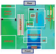 Организация расположения компонентов подчинена одной идее: прямой поток воздуха, не встречая препятствий, то есть, безо всяких завихрений, должен проходить через самые "горячие" комплектующие. От процессора к радиатору системной логики, обдувая модули памяти и видеокарту, воздух переходит к блоку питания, в котором вентилятор работает на выдув. Вполне очевидно, что такой конструктив позволяет избавиться, как минимум, от двух корпусных кулеров, работающих на впуск и на выпуск.