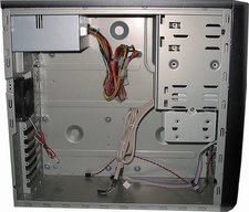 Места для установки жестких дисков и дисковода тоже неплохо продуманы, но вместительность их малая. Вероятно, производитель тем самым только хотел подчеркнуть предназначение корпуса для сборки домашнего или офисного компьютера. Как раз именно здесь и установлен встроенный картридер. Он оснащен длинными проводами, поэтому никаких проблем при подключении не возникнет. А вот с держателями для винчестера явно видна проблема: хотя все сделано максимально открыто для улучшения вентиляции жесткого диска, но места для установки катастрофически не хватает. Видимо, инженеры исходили из того убеждения, что в домашнем компьютере стационарно используется один винчестер.