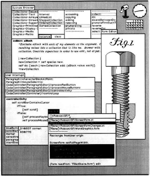 Отдельные окошки в Smalltalk’e окаймлялись графической границей и выделялись на сером фоне. Каждое из окошек обладало заголовком вверху, который позволял идентифицировать окно и передвигать его по экрану. Заголовок окна не растягивался на всю длину принадлежащего окна, а лишь ограничивался своей собственной длиной, начинаясь в левом верхнем углу. Окна могли перекрывать друг друга, и выделенное окно переходило на передний план к пользователю. В это же время была осуществлена концепция "иконок" – маленького символьного представления программы или документа, которое можно было кликнуть, чтобы запустить или манипулировать им. Здесь же появляются выпадающие меню – пользователь кликнет одной из кнопок мышки и появляется иерархическое графическое меню, содержимое которого зависит от выполняемых операций. Впервые появляются полосы прокрутки (скроллбары), радио кнопки и диалоговые окна.
