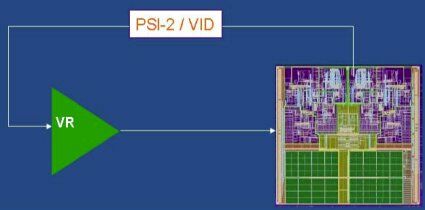 Каждый процессор Core 2 содержит микросхему, которая отслеживает требования к энергопотреблению. Если ваша материнская плата оснащена контроллером PSI-2, он может принимать сигнал и регулировать нагрузку стабилизаторов напряжения, используя их наиболее эффективно. Когда энергопотребление процессора снижается, контроллер PSI-2 это определяет и может выключить один или больше стабилизаторов напряжения (рисунок4).