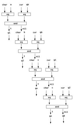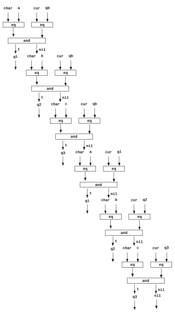 a, b, c – входной алфавит, из которого формируются строки, считываемые автоматом;