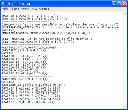 (PRINT (LIST 'MULTIPLICATION_MATRIX (MULT_MATRIX MATRIX1 MATRIX2 ROW1 ROW2 COL1 COL2)) OUTPUT_STREAM)