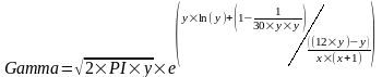 (SETQ GAM (* (SQRT (* 2 (/ PI Y))) (EXP (+ (* Y (LOG Y)) (- (/ (- 1 (/ 1 (* 30 Y Y))) (* 12 Y)) Y)))))