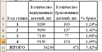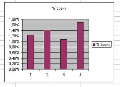 С помощью команды Вставка->Диаграмма по полученной сводной ведомости построить график процента брака, выдаваемого каждым станком: