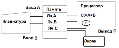 Вернемся к вопросу об архитектуре ЭВМ - исполнителе вычислительных алгоритмов. Как известно, одним из важнейших практических принципов в методике обучения является принцип наглядности. За каждым изучаемым понятием в сознании ученика должен закрепиться какой-то визуальный образ. Успешность поучения алгоритмизации при использовании учебных материалов объясняется именно наличием таких образов как (Черепашки, Кенгуренка и др.). Можно еще сказать так: архитектура исполнителей является наглядной, понятной ученикам. Исполнителем вычислительных алгоритмов (алгоритмов работы с величинами) является компьютер. Успешность освоения программирования для ЭВМ во многом зависит от того, удастся ли учителю создать в сознании учеников наглядный образ архитектуры компьютера-исполнителя. Работа с реализованными в виде исполнителей учебными компьютерами («УК Нейман», «Кроха», «Малютка» и др.) помогает решению этой задачи. Составляя вычислительные алгоритмы, программы на языках высокого уровня, ученики в своем понимании архитектуры могут отойти от деталей ячеек памяти, типов регистров процессора и т.п. подробностей, но представление об общих ЭВМ по выполнению программы у них должно остаться. Вот как должен представлять себе ученик выполнение алгоритма сложения двух чисел (рис. 11.8):